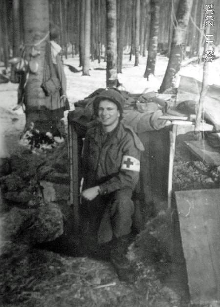 Another route through the repple depple was through a medical aid station. The first get to a man wounded or ill was the platoon or company medic with his limited training. Bob Heller was a Company C medic. He told me how he got the job. An officer had told him, “drop your rifle, Heller, you’re the medic.” He was given a book on horse anatomy and followed some of the other medics around. He had morphine, aspirin, and bandages as his arsenal.