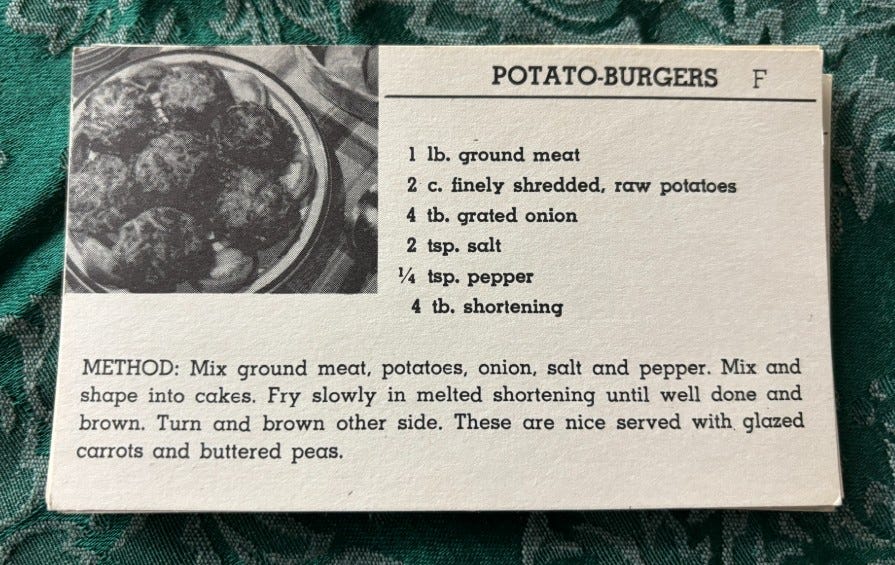 The newspapers were full of recipes to use strange cuts of meat or substitutions for absent ingredients and new uses for old ingredients. Lessons on Victory Gardens and Victory Cooking were everywhere, even Chicago’s Museum of Science and Industry. Or you could buy Mrs. Leister’s recipe box. Every card had a photo of the dish to show how it could be presented to make it look appetizing.
