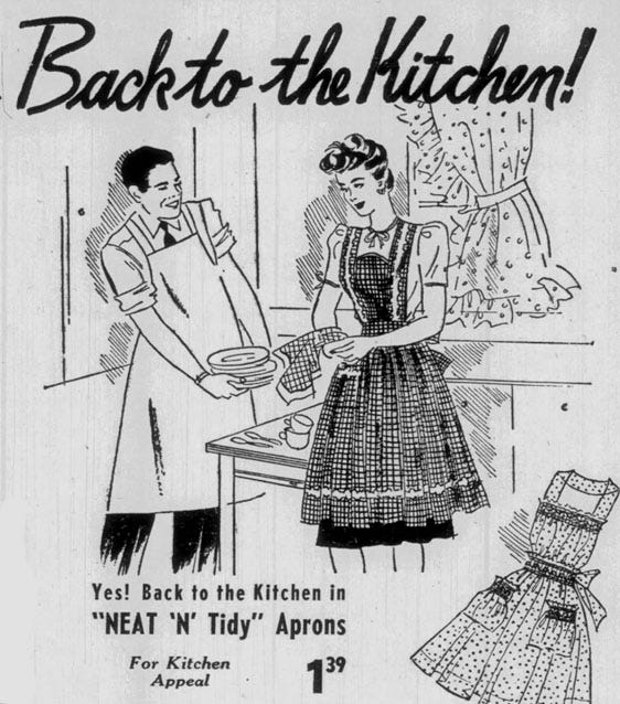 They might just be referring to the man bringing dishes in from the dining table. But men were not back in the kitchen. They had been drafted, or the couple was working separate factory shifts of long hours, trying to handle childcare. It wasn’t fun. Time was scarce and there were no frozen foods, no prepared food, no fast food, or takeout in most towns, and the things that were fast and familiar to cook weren’t available.