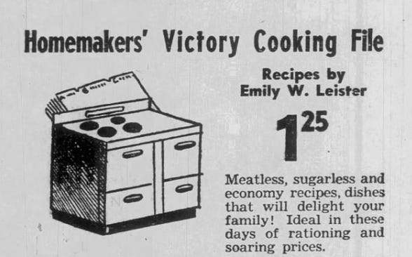 Weirdly, the ad for the Victory File inspired Walker’s Department Store in Long Beach, California, to advertise it and rationing as a lovely return to the kitchen.